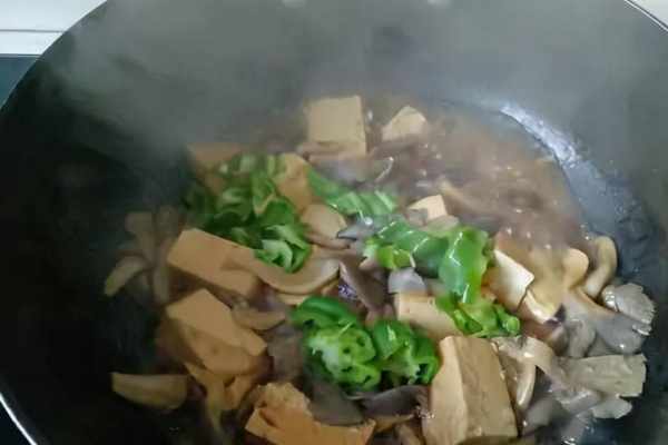 第八步,小火燜煮5分鐘,加上切好的青椒配色,煮1分鐘即可,嘗一嘗咸淡,撒上切好的蔥段。