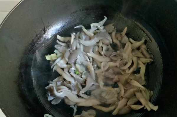 第五:起鍋加上一些食用油(豬油湯汁煮出來更美味),加上一些薑和蔥煸炒,加上鮮蘑菇絲,快速把蘑菇炒至變軟。