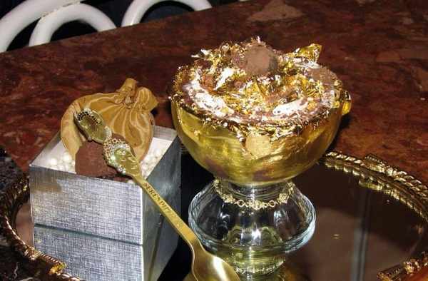 這曾是《吉尼斯世界紀錄》上最貴的甜點,靠著28顆世上最稀有的可可豆制成。杯子內直到杯緣,全都填滿瞭食用金箔。在杯子邊緣還有一個18k金的手環與1克拉白鉆石。