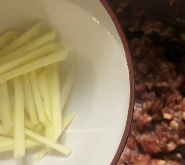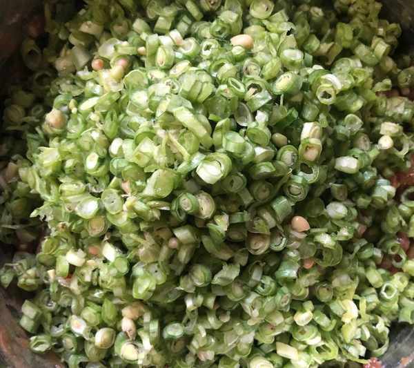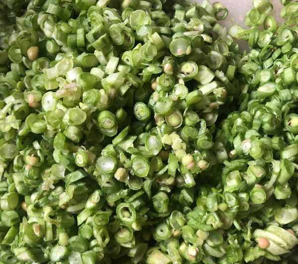 2、然後將豆角洗幹凈之後去掉筋,切碎備用,我用的是四季豆,大傢也可以用豇豆角。
