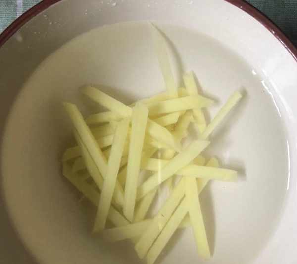 3、然後將一塊生薑去皮之後切成絲放入水中浸泡一下。