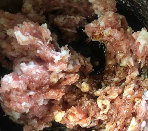 5、將浸泡生薑絲的水分三次倒入在豬肉餡中,然後攪拌,攪拌的時候要順著一個方向攪拌,直到豬肉上勁就可以瞭。