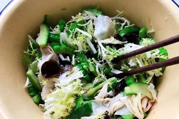 【烹飪食材】:苦瓜一根、黃瓜兩根、苦苣一小把、木耳一小把、腐皮少許、鹽適量、雞精少許、香油少許