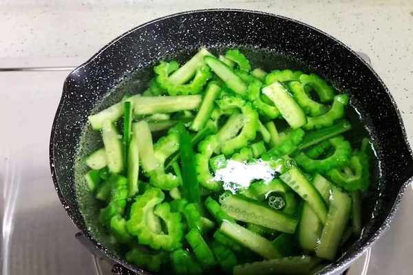 5、黃瓜和苦瓜醃制好瞭之後將多餘的水分到處去,然後放入開水中焯一下,大約是煮一分鐘就可以瞭,撈出來瀝幹水分備用。