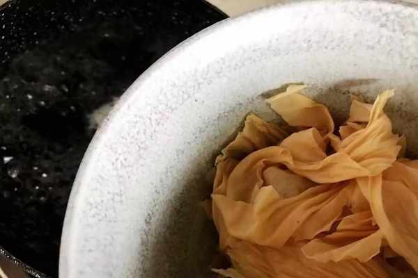 4、鍋中添加適量的水燒開,然後將浸泡好的木耳放入水中焯一下,大約5分鐘之後撈出來瀝幹水分備用,再將腐皮放入水中稍微燙一下就可以撈出來擠幹水分備用。