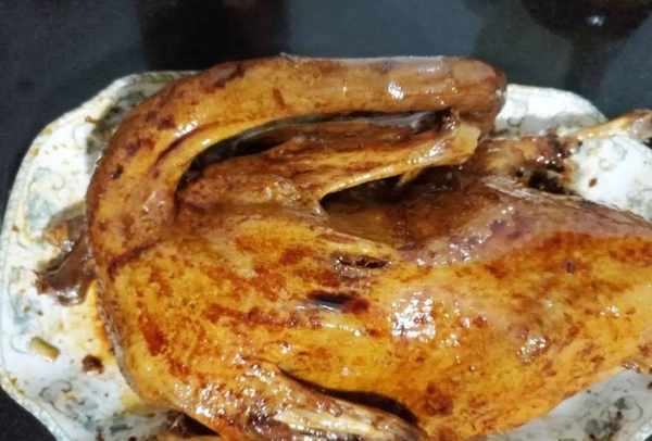 6、鴨子蒸好後,放涼。用刷子在表皮面刷上老抽醬油。(或者糖色,或者蜂蜜),油炸的話,表面再拍上面粉。