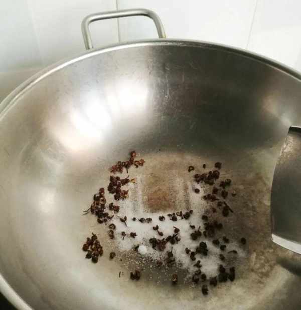 2、鍋燒熱,放入花椒,小火炒1分鐘,炒香。放鹽再炒1分鐘