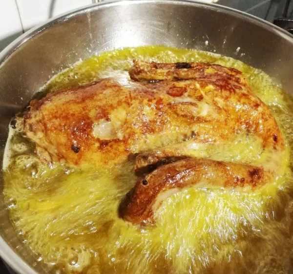 7、鍋中倒入適量的油,盡量多點,油多點炸的效果更好。油溫五六成熱就放鴨子,油溫過高容易炸糊。翻面炸,兩面炸成金黃,不要炸糊瞭。