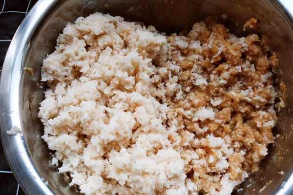 5.把蓮藕和肉餡和在一起拌勻。
