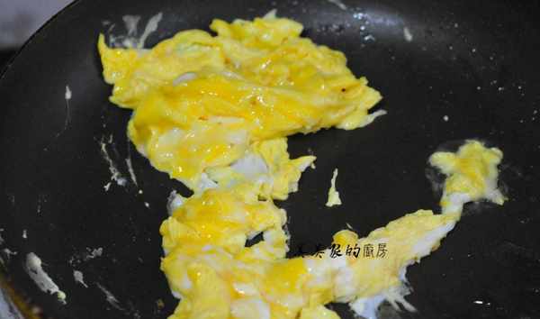 油鍋燒熱,將雞蛋液倒入鍋中,炒至凝固,稍微炒散備用。