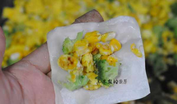 將西蘭花和玉米碎都倒進鍋中,加入順利鹽,混合均勻,餡就做好瞭。