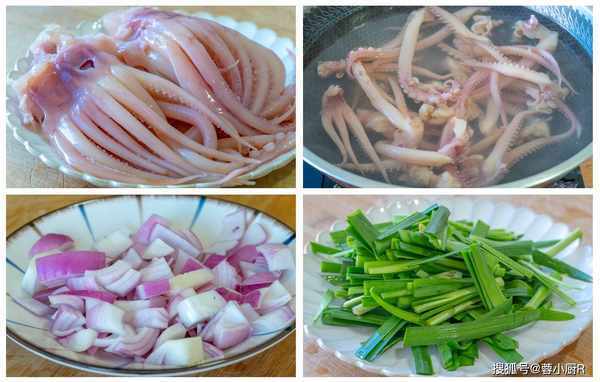 1、魷魚須去掉眼睛和內臟,然後改刀切小一點;起鍋焯水,水開倒入魷魚焯水,鍋裡的水再次燒開撈出魷魚,瀝幹水分備用。