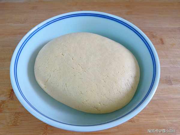 3、現在來和面,面粉300克,用南瓜泥來和面,這個面團兒會有些粘手,耐心地多揉一會兒,揉成一個光滑的面團兒後醒發30分鐘;