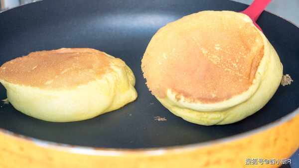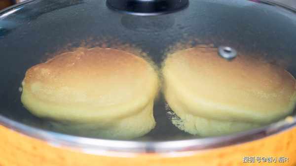 4、拌好後就可以開始煎瞭,平底鍋預熱刷油,舀入1大勺面糊之後再舀一勺堆疊在一起,加少許清水,蓋好蓋子小火3分鐘;打開鍋蓋翻面,蓋上鍋蓋再煎一分鐘,關火燜三十秒就可以瞭
