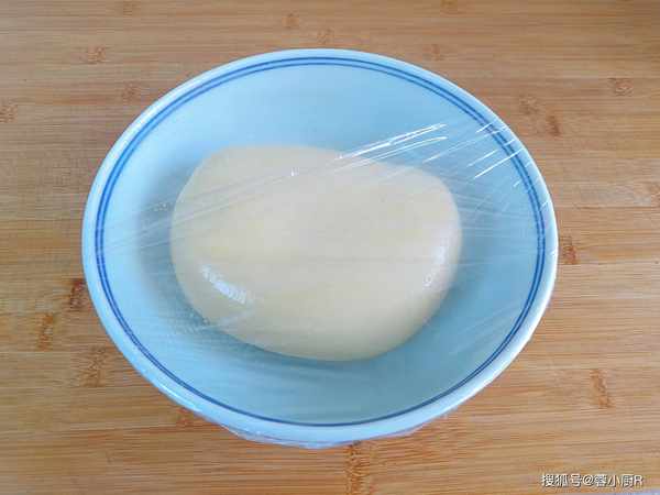 7、接著蓋上保鮮膜開始發面,發至面團兒體積的兩倍大,最近的溫度高,面團兒發的比較快,1個小時左右就夠瞭。