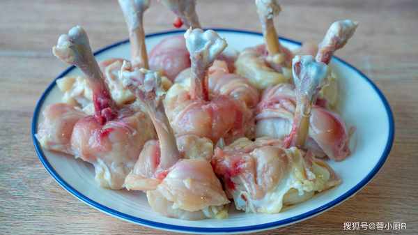 1、雞腿兒洗凈後去骨,這個骨頭不用完全去掉,先用剪刀把頂部關節處剪開,再把肉全部往下捋一捋,再修剪一下黏連在骨頭上的肉,翻過來就是棒槌的形狀瞭;