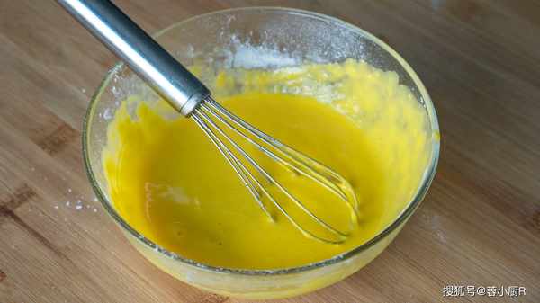 1、準備兩個無水無油的碗,打入3個雞蛋;蛋清蛋黃分離,蛋黃中加55克牛奶,用手動打蛋器攪拌均勻;