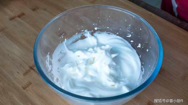 2、現在來打蛋白,先加幾滴檸檬汁,再加三分之一的白糖,打到粗泡加入三分之二的白糖,蛋白裡面總共要加的白糖是20克,轉高速繼續打,打到出現紋路加入剩下三分之一的白糖,繼續用中速打,提起打蛋器有短小的小彎鉤或者是小尖角就可以瞭;