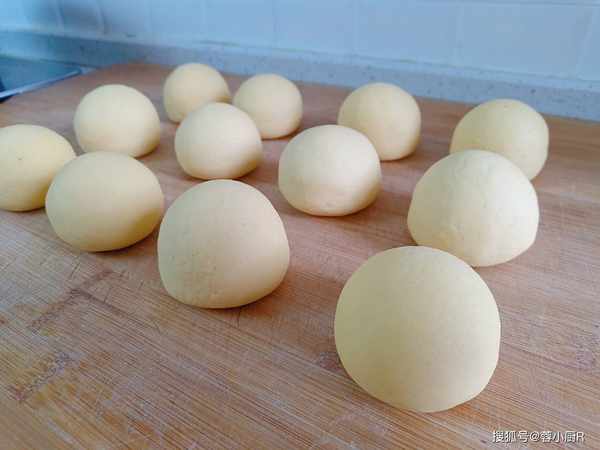 8、面團兒發好後移到砧板上後揉搓排氣,接著搓長條,分成30克左右一個的小面劑子,接著依次搓圓。