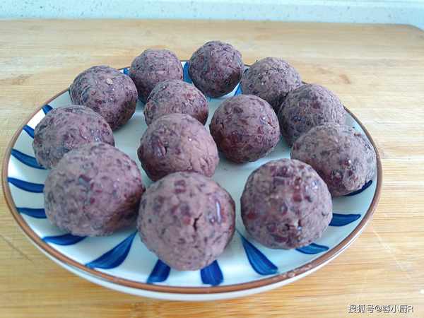 5、放涼後再取小團兒紅豆餡兒,搓成圓形就可以瞭。如果覺得有點粘手的話,可以戴上一次性手套,或者是雙手抹少許油,會更方便操作。