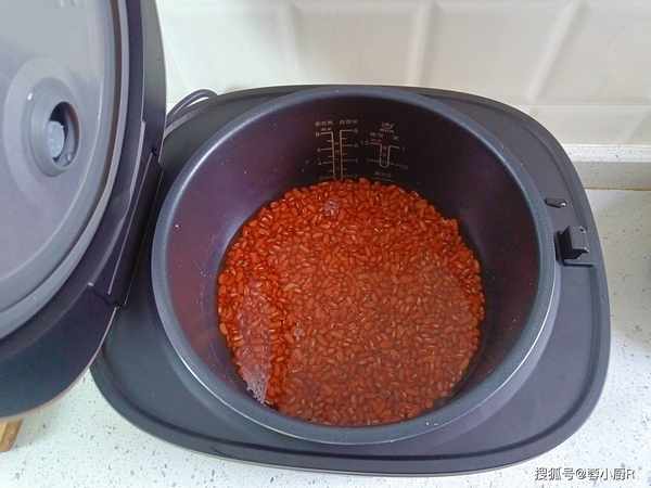 2、紅豆泡好後倒入電飯煲中,加入適量的清水,水量和紅豆剛好齊平就行,接著按下煮飯鍵功能開始煮。