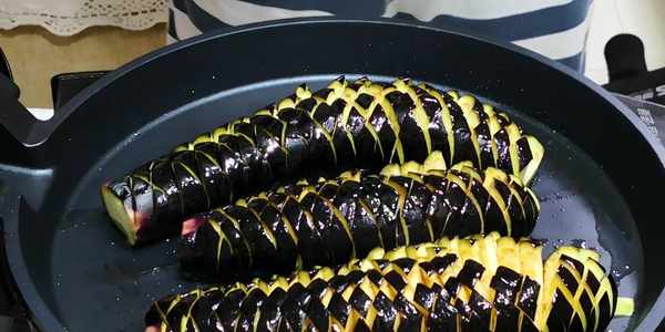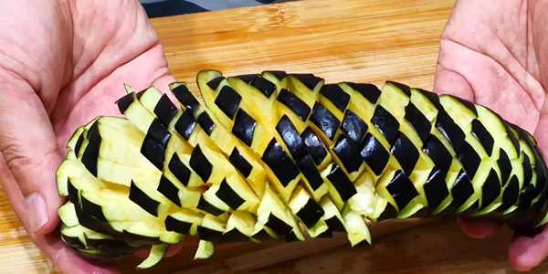 1、洗凈的茄子去頭去尾,然後切蓑衣花刀,就是將茄子先45度斜切片,但是底部不要切斷,如果不熟練,兩邊可以放上筷子,正向切完後,再反向45度切片,正常的所以切法,是可以拉成拉花的,我們做茄子是為瞭入味而且造型漂亮,茄子烹飪後比較軟,不適合拉花做法,所以蓑衣法切茄子不要換面,就像我這樣做就可以瞭。