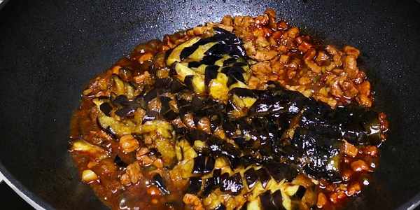 4、起鍋加油,油溫五成熱倒入肉丁,肉丁炒至變色,放入蔥蒜,炒出香味後加入一勺黃豆醬,然後將醬炸香,再加一點番茄醬,炒均勻後開始調味,加一勺糖和一勺鹽,再撒入點胡椒粉,翻炒均勻後少加一點清水,然後倒入煎好的茄子,開大火燉5分鐘。