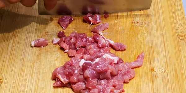 2、準備輔料:瘦肉先切片再切條,最後切成肉丁;大蒜先拍碎然後剁成蒜末;大蔥切成蔥花。