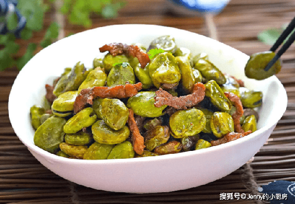 蠶豆熟瞭,倒入肉絲翻炒均勻,再加入少許雞精翻炒幾下,這道菜就做好瞭。出鍋後撒點蔥花點綴即可。