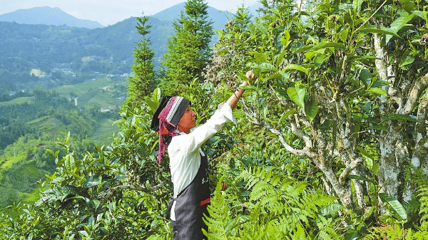 近年來,麻栗坡縣持續做大做強茶產業,全縣種植茶葉3.54萬餘畝,有古茶樹30萬株以上,古樹茶已成為當地重要的產業品牌資源,有4個鄉鎮被列入普洱茶地理標志產品保護區域。圖為猛硐瑤族鄉群眾在采摘古樹茶。 記者 張文峰 攝