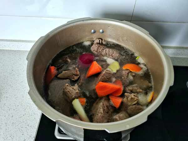 4、最後再放幾塊紅蘿卜、滴幾滴白酒,蓋上鍋蓋,燉20分鐘,這是高壓鍋,燉20分鐘就好,如果是普通煮鍋,大約要燉一個小時。