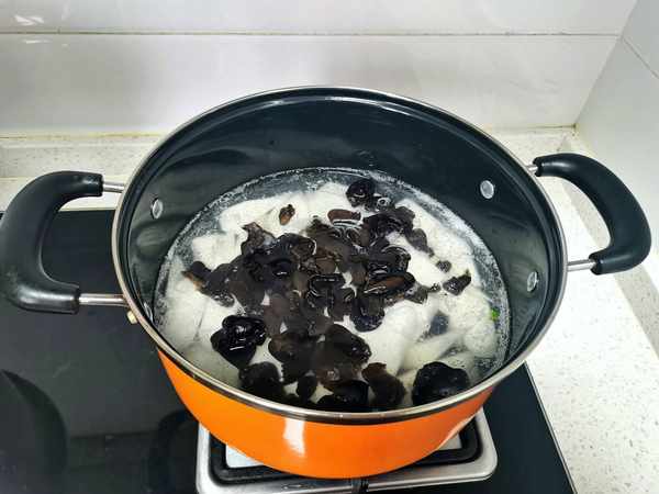 6、把山藥切塊,和木耳一起焯水,山藥焯水去掉黏液,使燴肉湯清澈好喝,木耳焯水能去除清洗不幹凈的雜質,吃起來更加的健康放心。