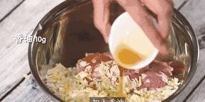 2、盆中放入白菜、豬肉餡,加入香油、黃豆醬、十三香調料