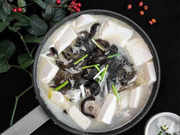 3 將煎好的魚頭及煎魚的油放入砂鍋中,倒入足量的開水,放入薑片,蔥結大火煮5分鐘後放入豆腐再煲5分鐘左右,接著放入菌菇煲熟,調入鹽,少許雞精,豬油,撒上香菜碎或蔥花及白胡椒粉即可。