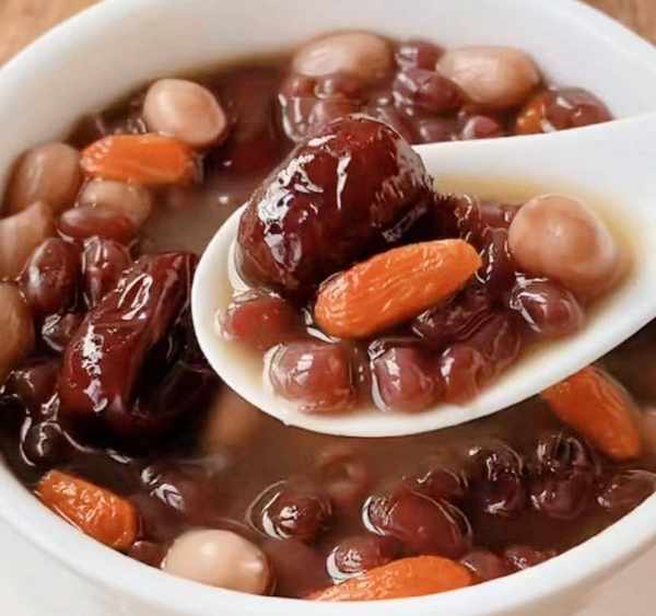 主要材料:紅豆、帶皮花生、紅棗、枸杞、紅糖