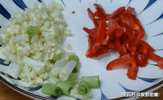 接下來,準備幾瓣大蒜拍扁後剁成蒜末,一節蔥白切成蔥花。半顆紅彩椒去籽後切成絲,切好一起收入盤中。