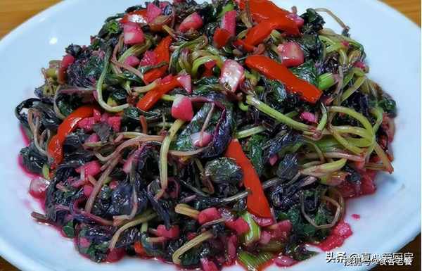 炒鍋中油溫燒至5成熱,下入蔥蒜末炒出香味,倒入一勺蠔油,一勺生抽,翻炒出香味。再倒入莧菜,大火翻炒翻炒均勻。接著把紅彩膠倒入鍋裡,調味加入鹽,芝麻油翻炒均勻即可出鍋。