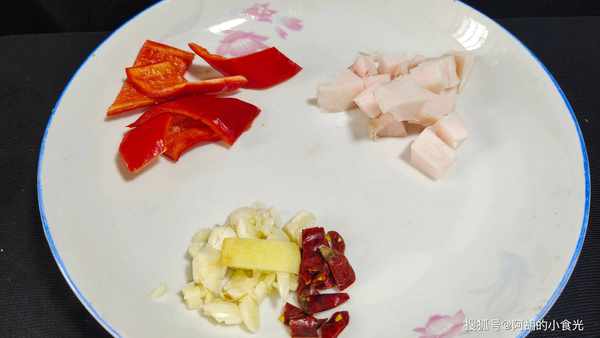 第四步:輔料準備幾片紅椒配色,再切一點蔥薑蒜和幹辣椒待用,再切一小塊豬肥膘增香提味。