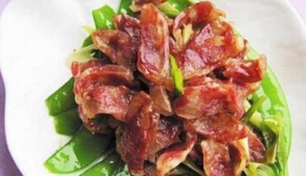 1、臘腸沖洗一下斜切成薄片,荷蘭豆去筋擇好,蒜苗切成小段。