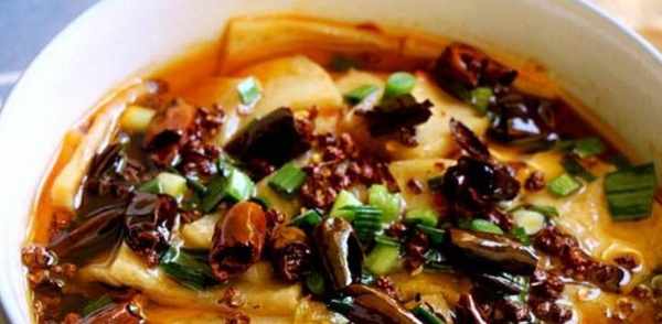 4、鍋裡再放入豆腐,調入少許醬油和鹽拌勻煮3分鐘撈出放入碗裡,加入原湯至與豆腐齊平,撒上剛才炸過的辣椒和花椒,最後再澆上一勺熱油激香後即可食用。