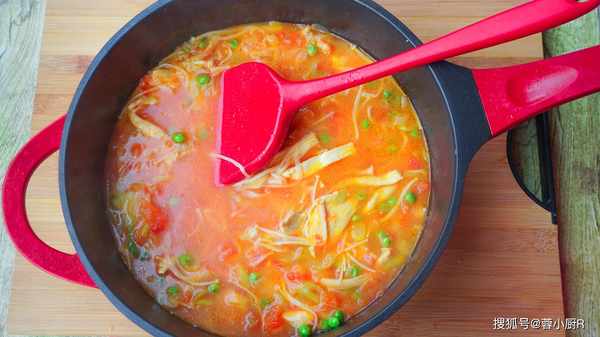 4、鍋裡加一勺油,下蒜爆香,西紅柿加進去,炒出湯汁;青豆加進去炒一會兒,一碗清水,大火煮開,小火再煮5分鐘,下入肉片,煮3分鐘;
