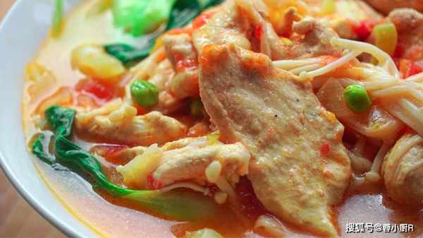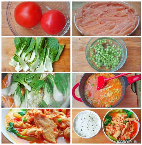 食材清單 :西紅柿、雞脯肉、1個蛋清、大蔥、上海青、金針菇、青豆