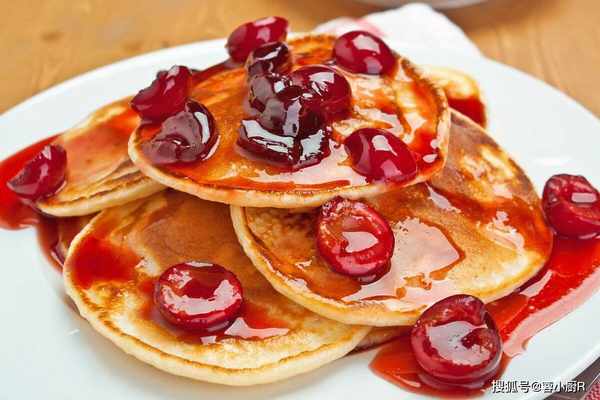 4、30秒翻面,30秒出鍋,一分鐘就可以出鍋瞭。最後淋上櫻桃醬就好瞭。