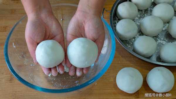 6、這時候我們再來看面團兒,取出來後直接揪一塊兒糯米團,搓圓後壓扁再捏成小餅。然後放入紅豆餡兒,用虎口轉動的方式包起來,收攏後捏緊實一些,最後再轉動幾下把表面搓光滑,粘豆包的生坯就做好瞭。我一共是做瞭19個,個頭不是特別的大。