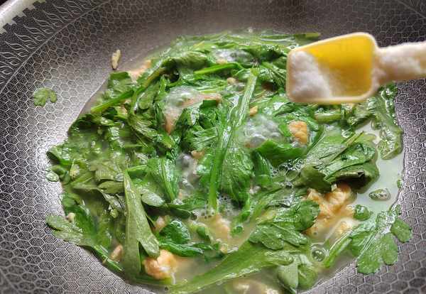 食材:茼蒿、雞蛋、花生油、鹽、料酒。