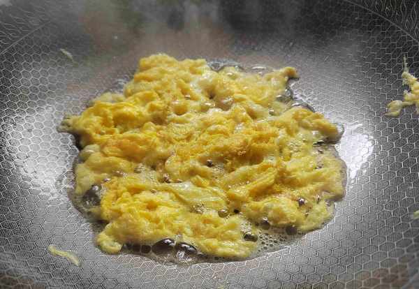 2、雞蛋加入料酒打散,倒入熱油中,煎至成型後,分成小塊。