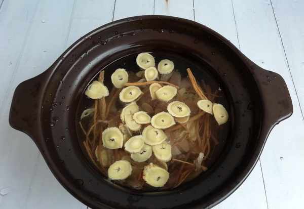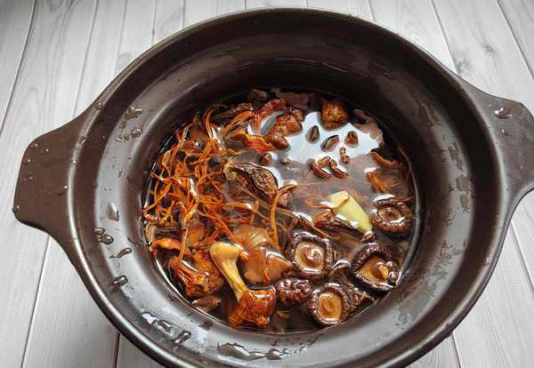 2、菌菇包清洗幹凈,放入砂鍋中,放入豬心和薑片,倒入清水,中火燉60分鐘。