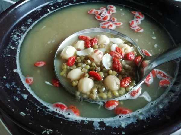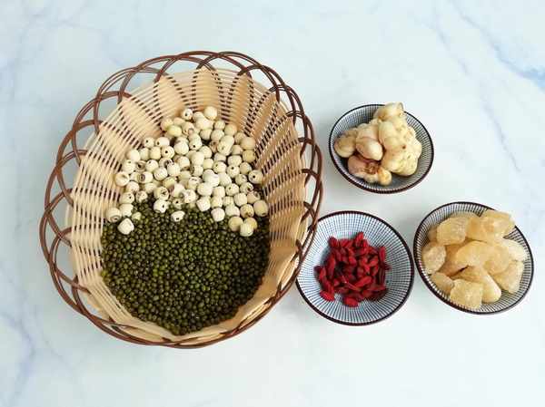 食材:蓮子幹、綠豆、新鮮百合、冰糖、枸杞。