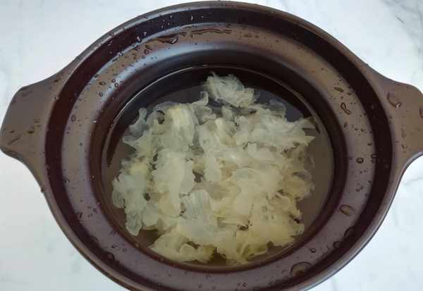 2、把銀耳放入砂鍋中,倒入清水,中火燉至湯汁濃稠。