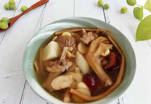 食材:新鮮蓮子、山藥、老鴨、紅棗、黃芪、黨參、鹽、料酒、薑片、蔥結。